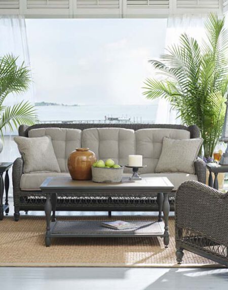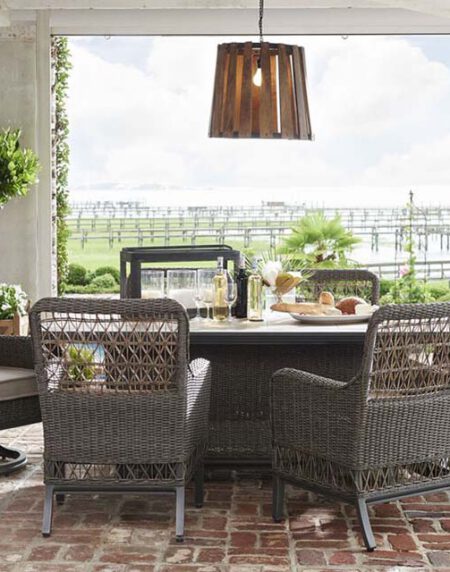 Elegant, cozy and relaxed. Words that define the Bungalow Collection. This new twist on a classic look features aluminum with a wood grain hand antique and woven material to withstand the elements. The tables complete the look with hand grouted porcelain tiles.