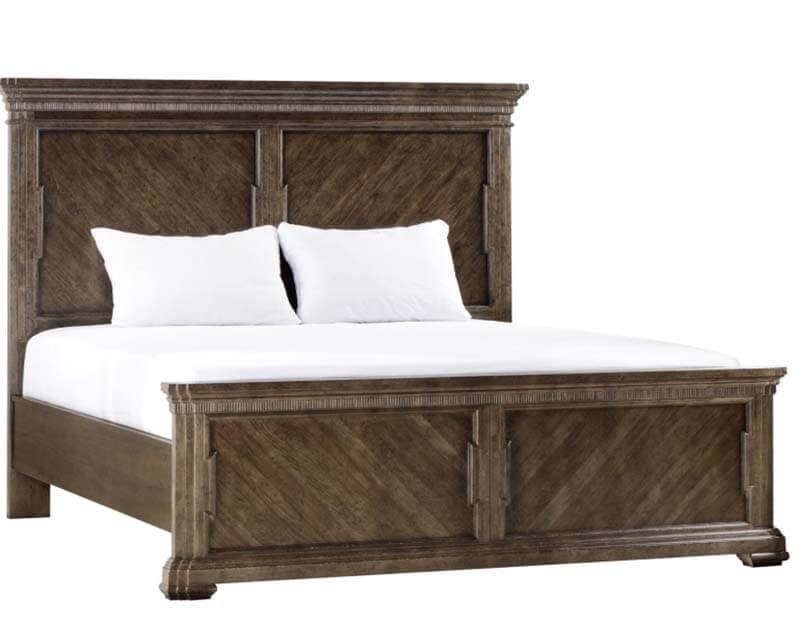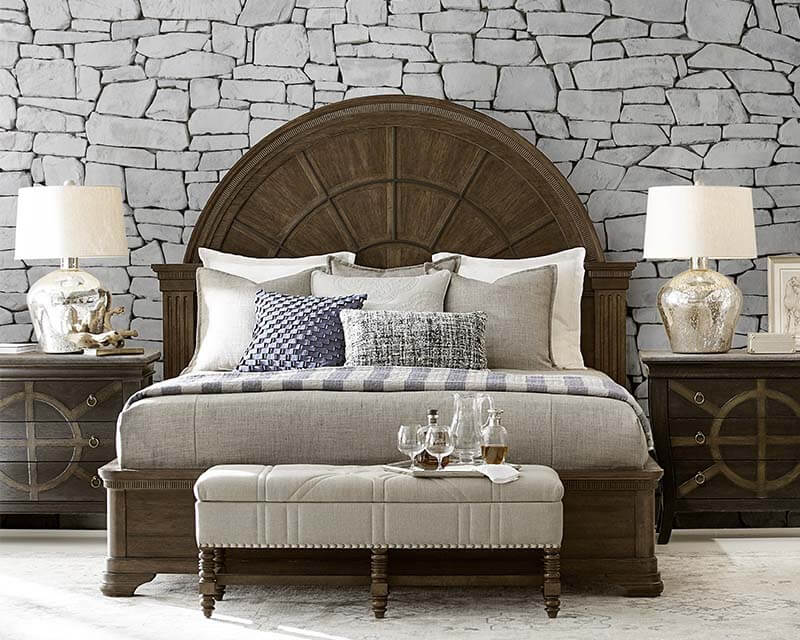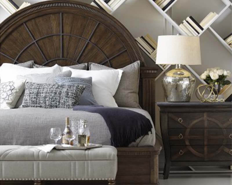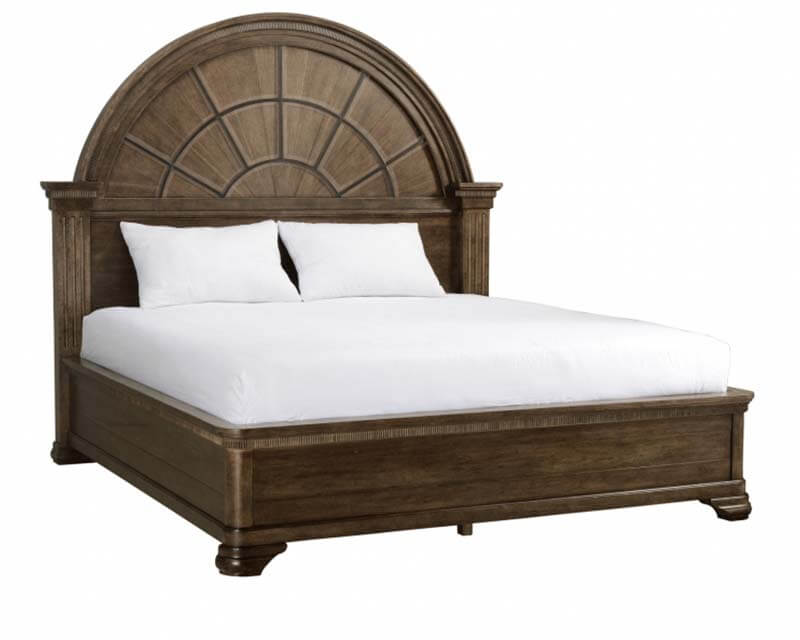 The handsome American Chapter Conservatory Bed by ART Furniture offers dramatic architectural detail, right down to the oxidized metal “mullions” that overlay the artful veneer of the arched headboard.