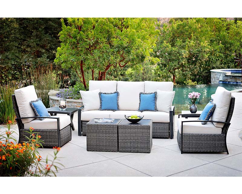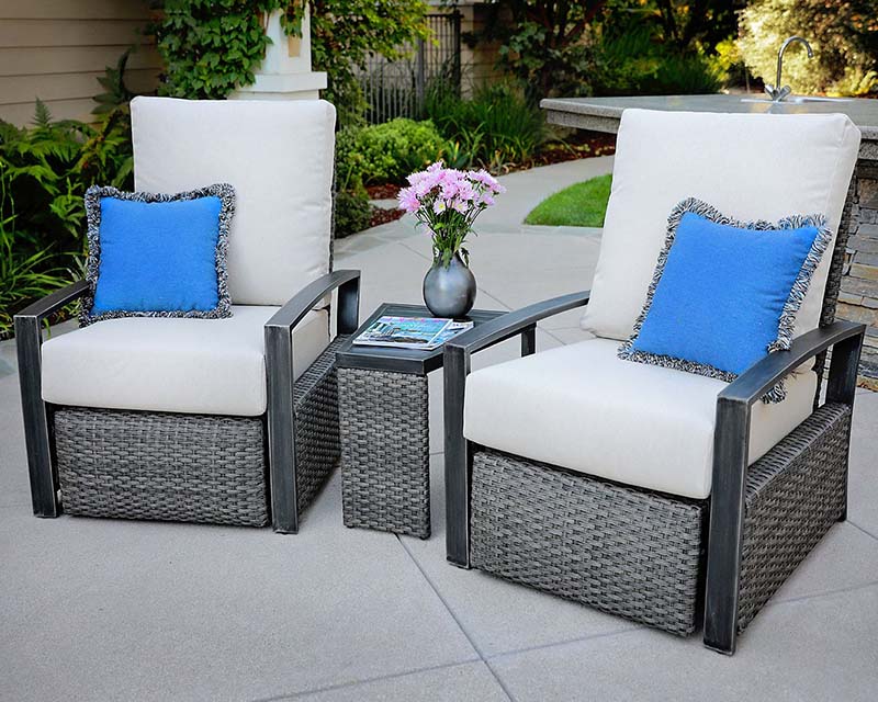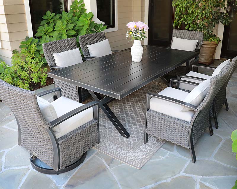 This classically transitional style woven PCV wicker design features exposed aluminum arms and front legs while the table top has an aluminum slat top with hand-applied antique finish.